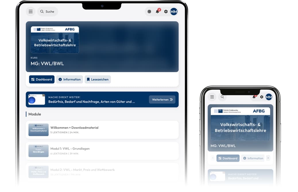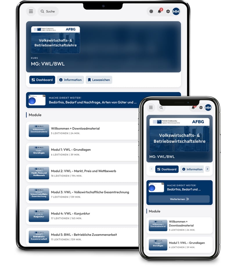 Unsere mediengestützten Lerninhalte ermöglichen flexibles Lernen per Smartphone, Tablet oder PC. Durch Videos, Übungsaufgaben, Live-Unterricht und persönliche Betreuung wirst du optimal vorbereitet. Lerngruppen, Aufzeichnungen und interaktive Übungen sorgen für eine effiziente und praxisnahe Prüfungsvorbereitung.