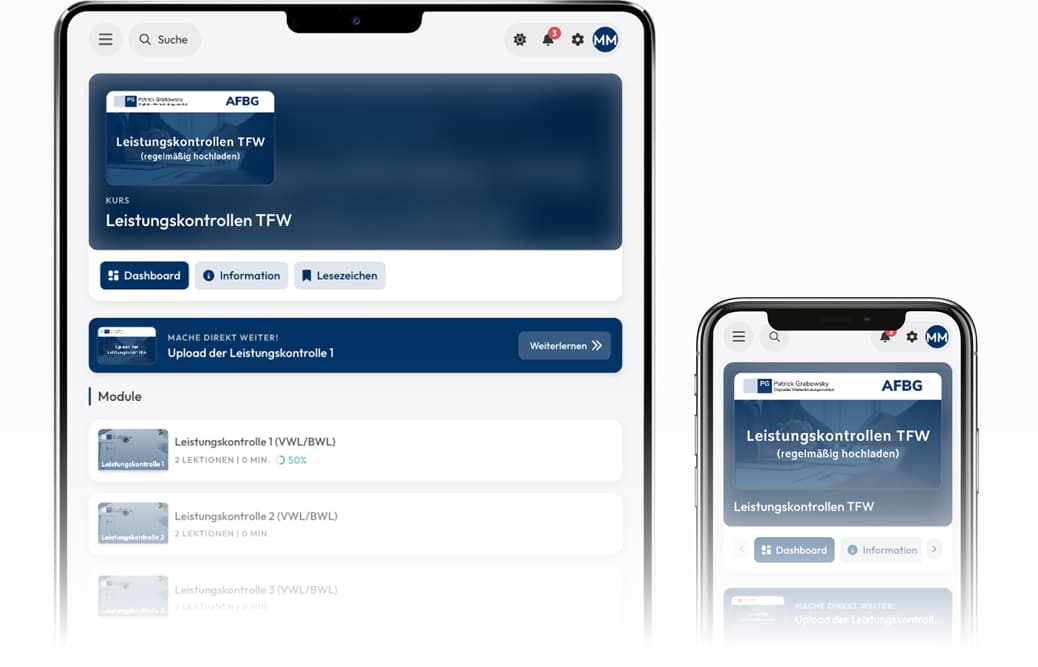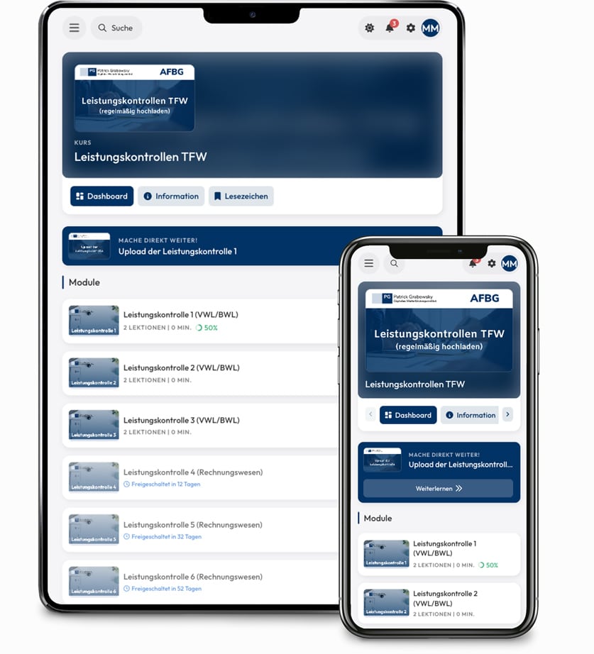 Unsere mediengestützten Lerninhalte ermöglichen flexibles Lernen per Smartphone, Tablet oder PC. Durch Videos, Übungsaufgaben, Live-Unterricht und persönliche Betreuung wirst du optimal vorbereitet. Lerngruppen, Aufzeichnungen und interaktive Übungen sorgen für eine effiziente und praxisnahe Prüfungsvorbereitung.
